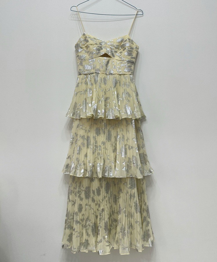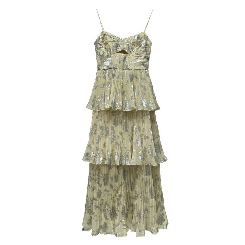 2023年春夏新品女装性感迷人黄色雪纺烫金百褶蛋糕长款吊带连衣裙