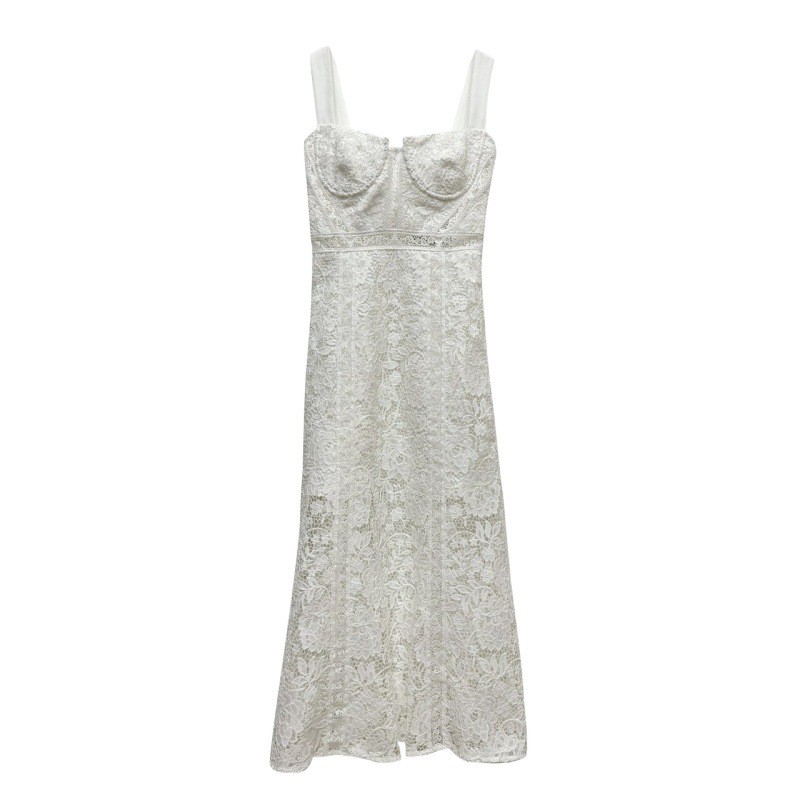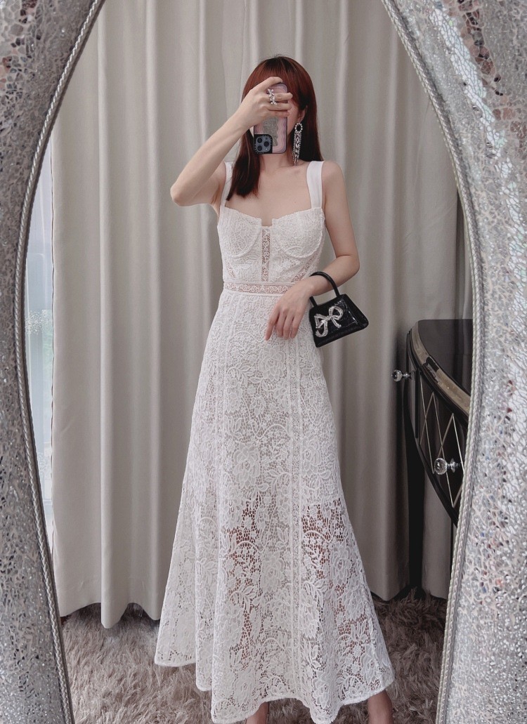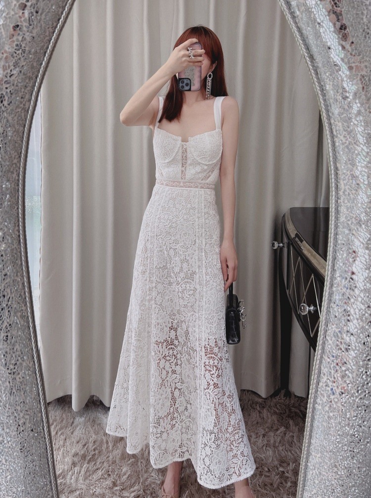 2023年新款性感露肩露背修身收腰气质显瘦吊带连衣裙白色蕾丝长裙