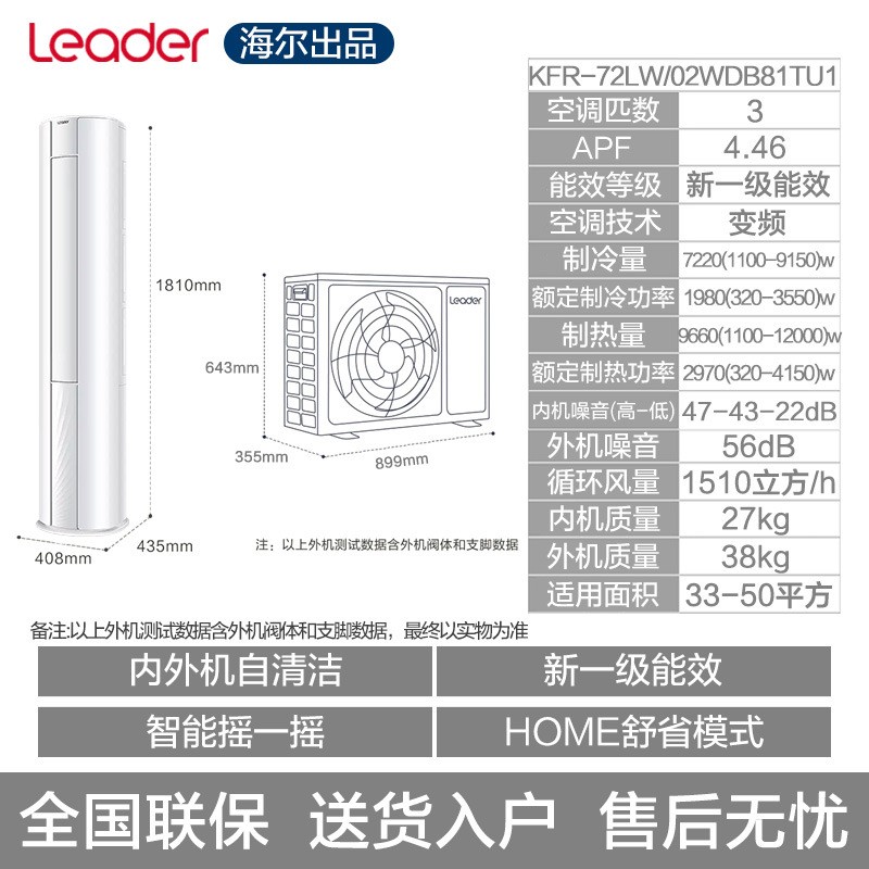 海尔统帅立式空调柜机大3P家用1级变频冷暖KFR-72LW/02WDB81TU1