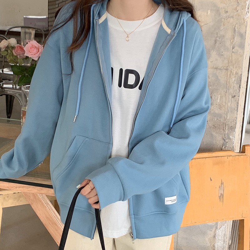 韩版宽松BF风长袖开衫连帽卫衣休闲外套女2023春秋学院风纯色上衣